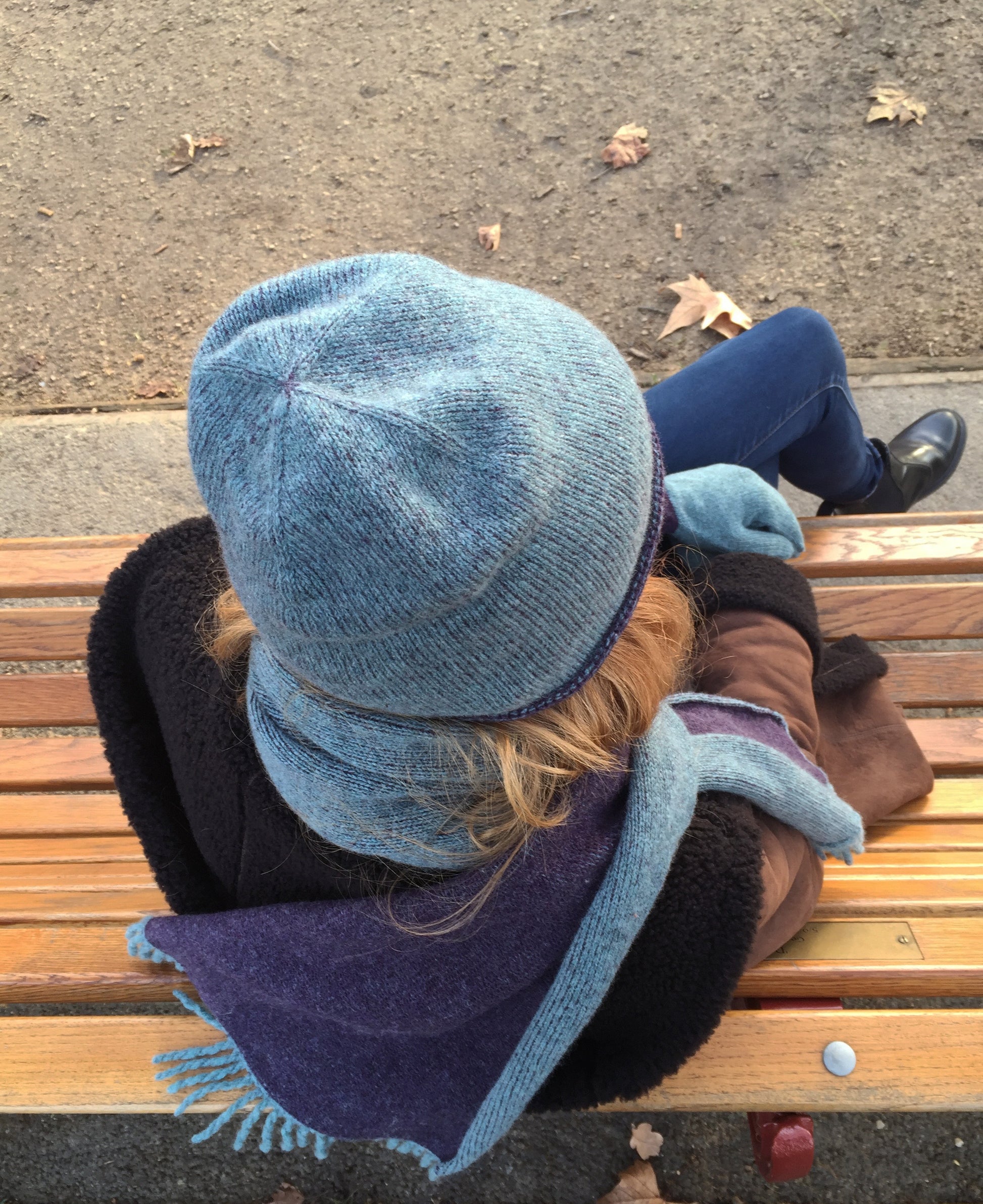 Knitted with two separate coloured yarns at the same time to create a layering effect, this also means it's double the thickness and gives the illusion of being colour reversible. The cast off edge naturally curls up to show the reverse colour which is a unique design feature.